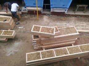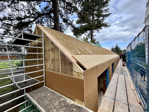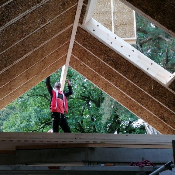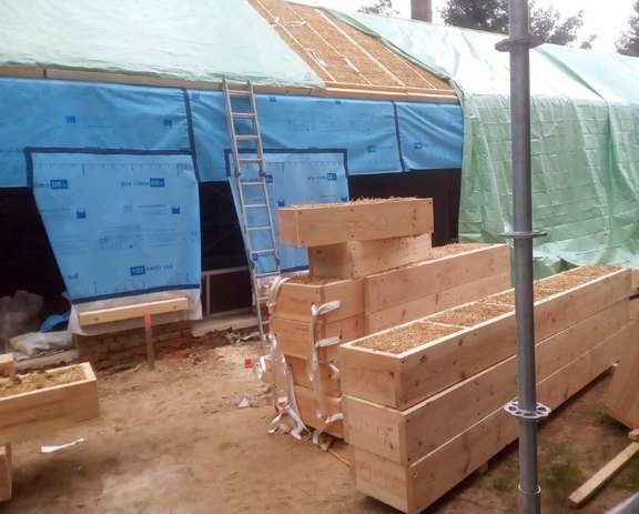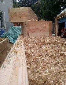 Mit viel Eigenleistung vor Ort beim Einbringen der Strohballen in die Holzständer wie dieses Strohballenhaus im Mittelherwigsdorf , Fertigstellung 2008